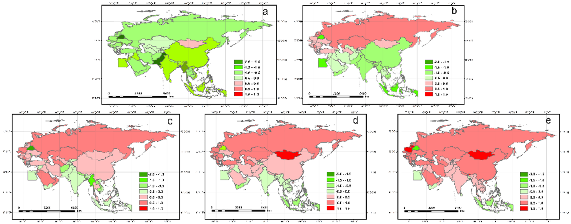 图1 “一带一路”地区水(a)、土地(b)、碳(c)、氮(d)和磷(e)环境可持续性赤字指数的空间分布